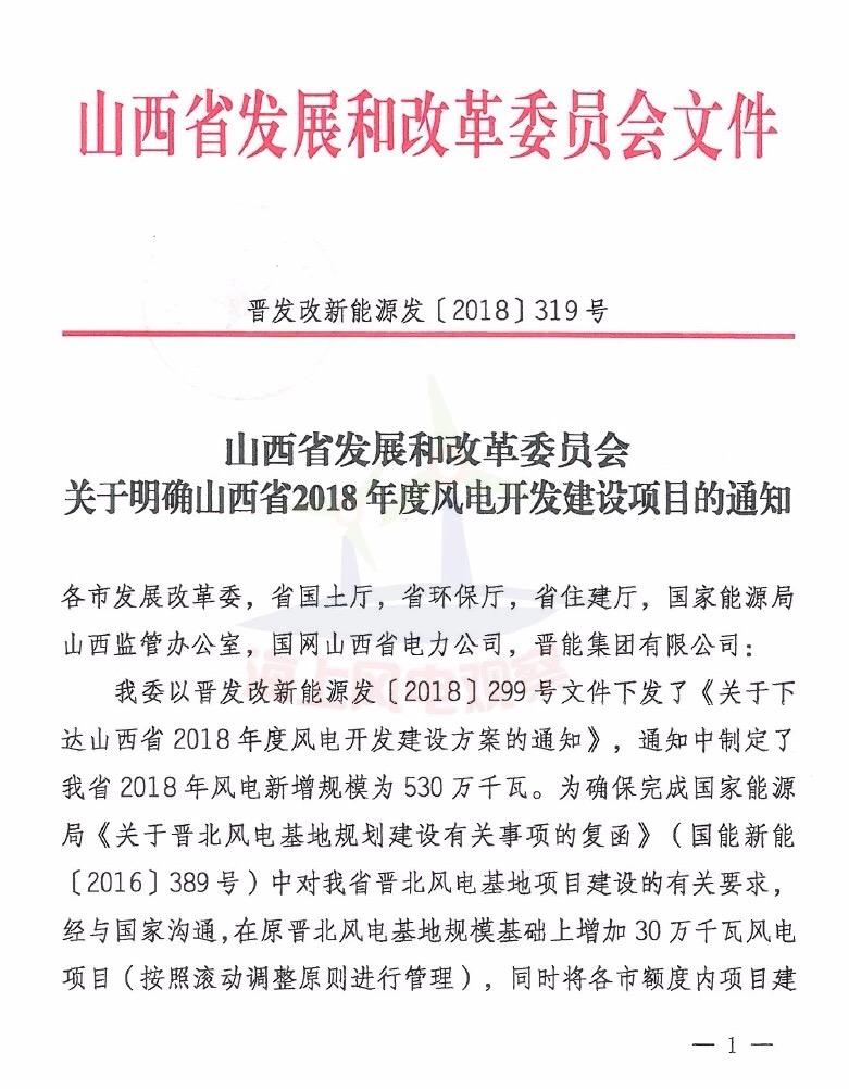 海上風電觀察獲悉,6月1日,山西發(fā)改委正式印發(fā)《關于下達山西省2018年度風電開發(fā)建設方案的通知》。