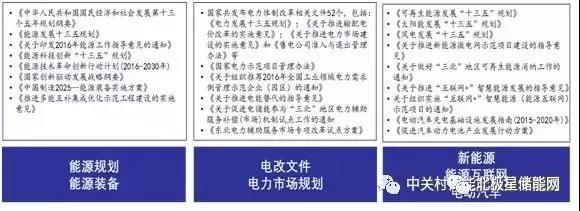 從2014年開始,多項與儲能發(fā)展相關的政策文件逐漸進入到我們的視線,主要分為三大類,能源規(guī)劃能源裝備類,包括《能源發(fā)展戰(zhàn)略行動計劃(2014-2020)》、《能源發(fā)展十三五規(guī)劃》等、電力體制改革和電力市場規(guī)劃類,包括2015年初發(fā)布的《新一輪電力體制改革》及其配套文件、以及第三類包含促進大規(guī)模可再生能源消納利用、能源互聯網和電動汽車推廣發(fā)展的多種政策。文件中都把發(fā)展和利用儲能作為重要工作內容,政策的發(fā)布都為提高儲能的認知度,確立儲能發(fā)展的重要性做出了貢獻。