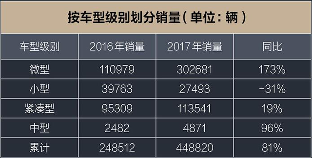 根據(jù)2017年純電新能源車(chē)的銷(xiāo)量來(lái)看,2017年純電乘用車(chē)?yán)塾?jì)銷(xiāo)量448820輛,相比2016年總體增長(zhǎng)了81%,這其中,微型電動(dòng)車(chē)?yán)塾?jì)銷(xiāo)量為30.2萬(wàn)元,占比純電動(dòng)乘用車(chē)總銷(xiāo)量的67.4%,同比2016年增長(zhǎng)173%。
