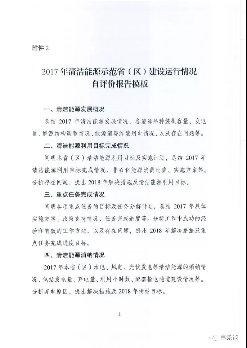 四、開展2017年清潔能源示范?。▍^(qū))評價工作。各有關(guān)省(區(qū))能源主管部門在2018年3月1日前提交2017年建設(shè)運行情況自評價報告。2017年清潔能源示范?。▍^(qū))建設(shè)運行情況自評價報告模板見附件2。
