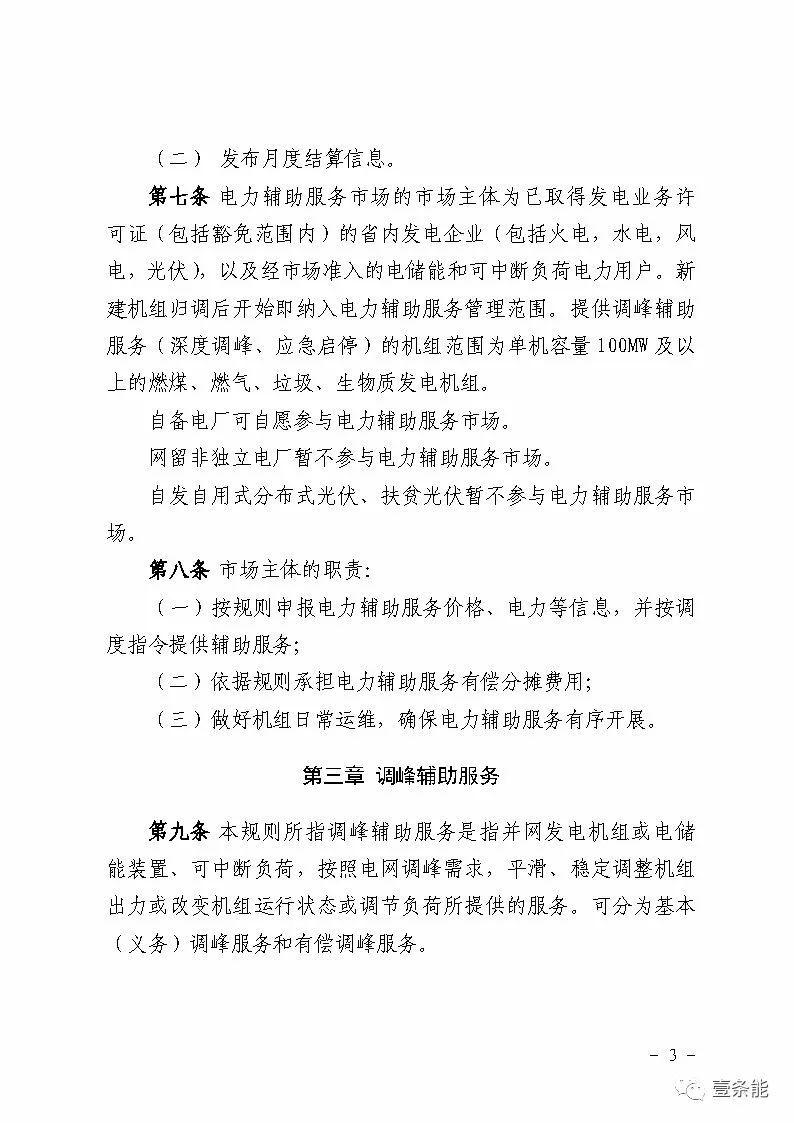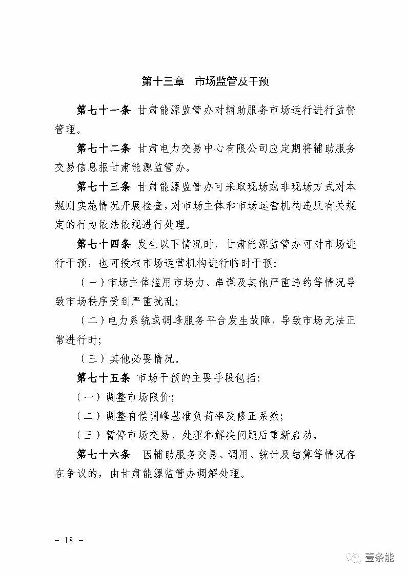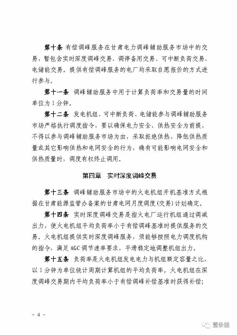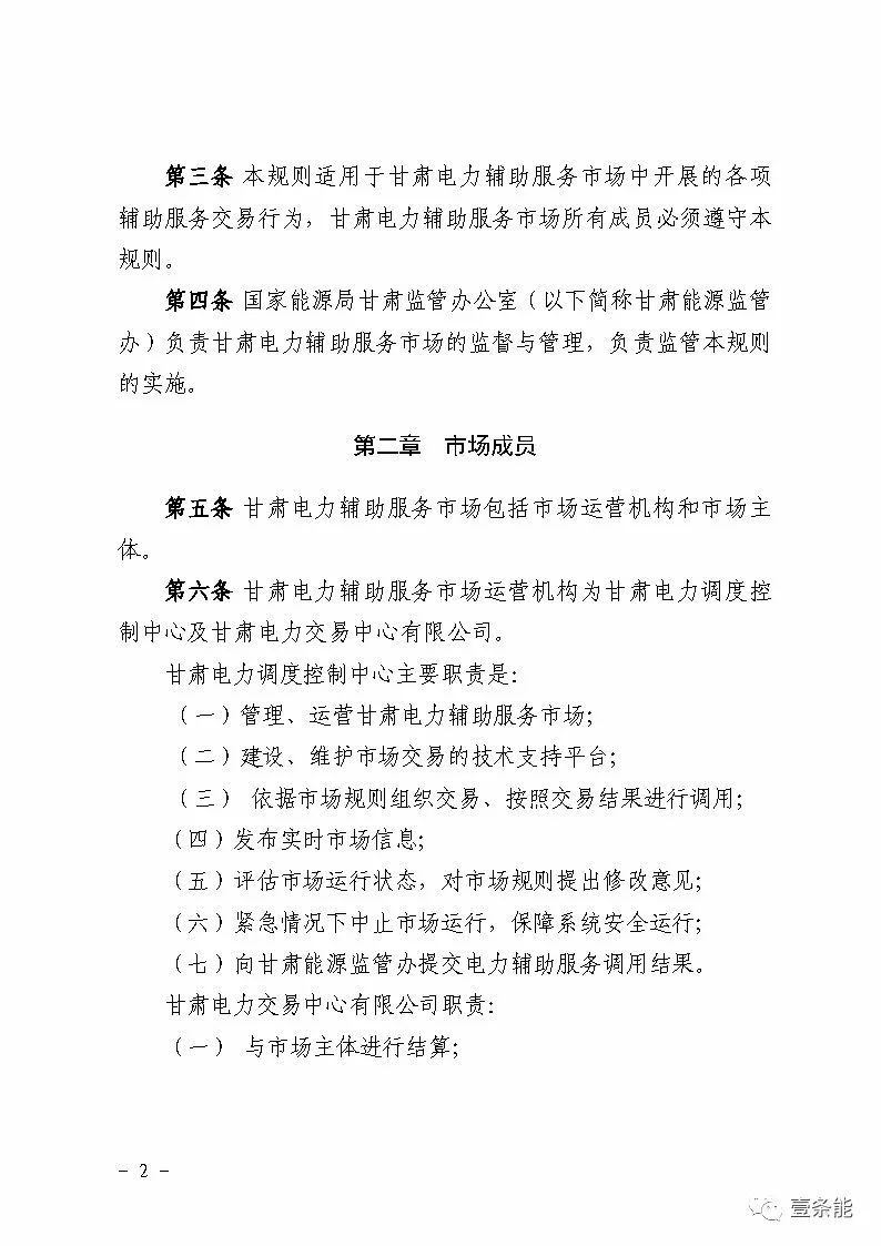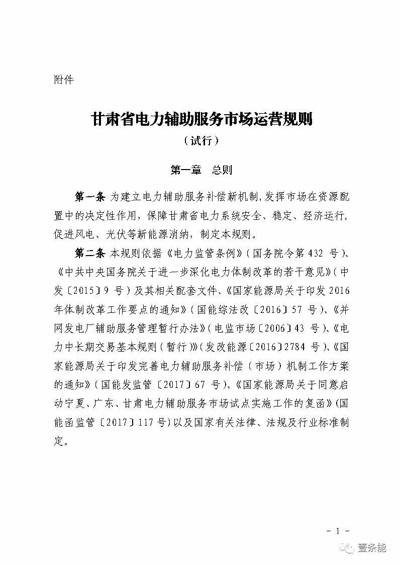 中國儲能網(wǎng)訊:國家能源局甘肅監(jiān)管辦日前發(fā)布了《甘肅省電力輔助服務市場運營規(guī)則(試行)》,于2018年4月1日起執(zhí)行。電力輔助服務市場的市場主體為已取得發(fā)電業(yè)務許可證的省內(nèi)發(fā)電企業(yè)(包括火電、水電、風電、光伏),以及經(jīng)市場準入的電儲能和可中斷負荷電力用戶。自備電廠可自愿參與電力輔助服務市場。網(wǎng)留非獨立電廠暫不參與電力輔助服務市場。自發(fā)自用式分布式光伏、扶貧光伏暫不參與電力輔助服務市場。