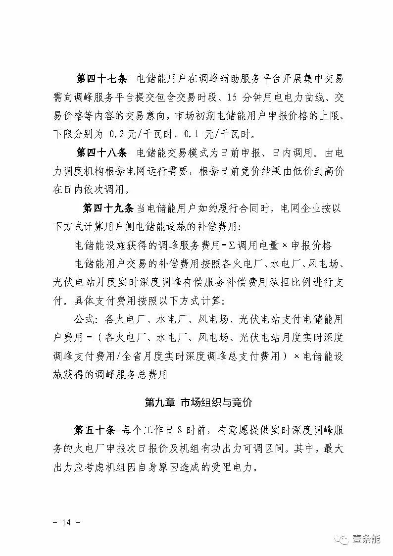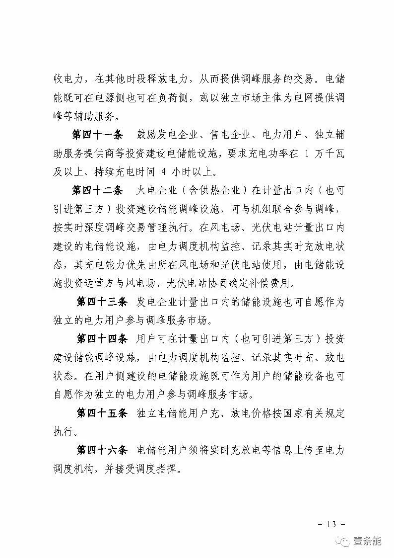 火電企業(yè)在計量出口內(nèi)投資建設儲能調(diào)峰設施,可與機組聯(lián)合參與調(diào)峰,按實時深度調(diào)峰交易管理執(zhí)行。在風電場、光伏電站計量出口內(nèi)建設的電儲能設施,由電力調(diào)度機構(gòu)監(jiān)控、記錄其實時充放電狀態(tài),其充電能力優(yōu)先由所在風電場和光伏電站使用,由電儲能設施投資運營方與風電場、光伏電站協(xié)商確定補償費用。