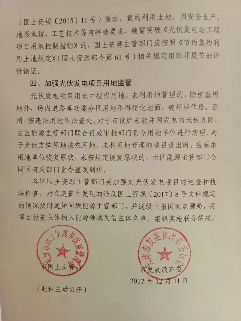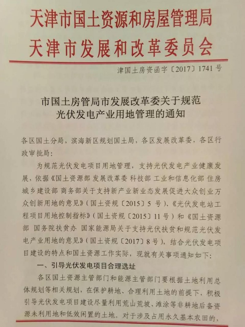 中國儲能網(wǎng):2017年12月11日,天津市國土資源和房屋管理局、天津市發(fā)改委聯(lián)合發(fā)布《關(guān)于規(guī)范光伏發(fā)電產(chǎn)業(yè)用地管理的通知》,對天津市光伏用地進(jìn)行進(jìn)一步的明確。
