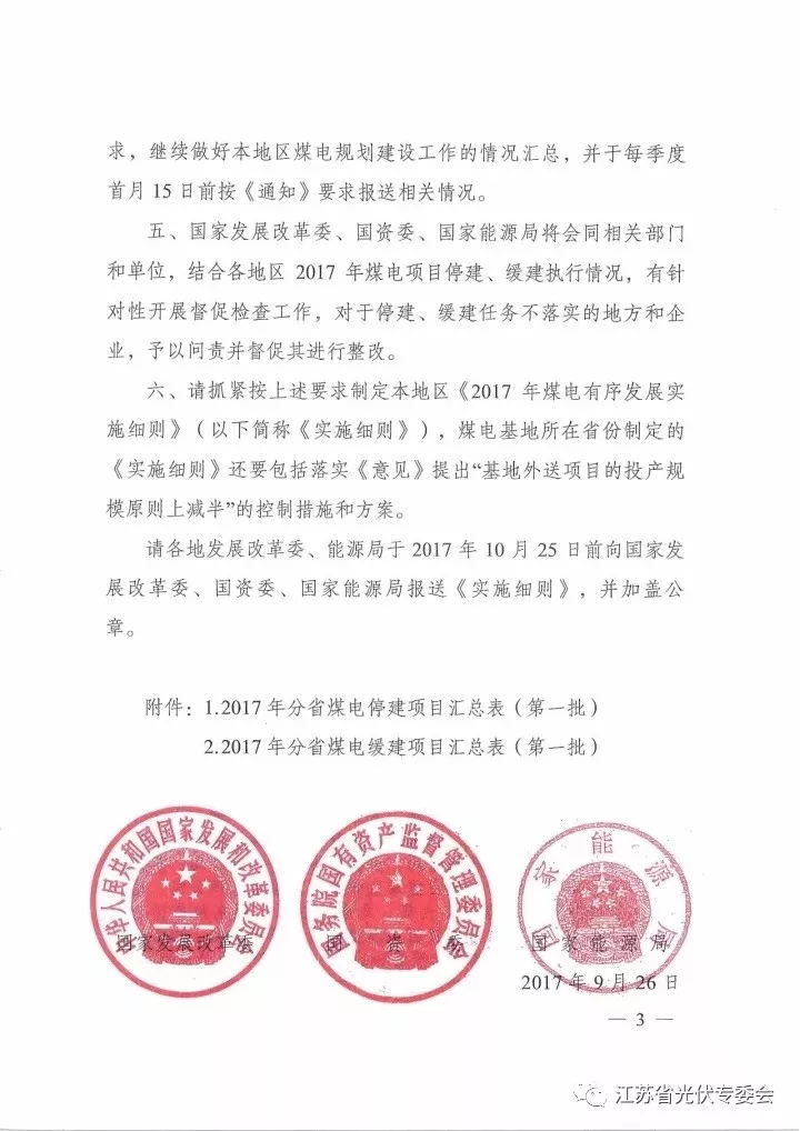 中國儲能網(wǎng)訊:為有力有序有效防范化解煤電產(chǎn)能過剩風險,確保完成2017年《政府工作報告》提出的煤電調(diào)控目標任務(wù),按照《關(guān)于推進供給側(cè)結(jié)構(gòu)性改革 防范化解煤電產(chǎn)能過剩風險的意見》(發(fā)改能源[2017]1404號)等相關(guān)文件要求,9月26日,國家發(fā)展和改革委員會、國務(wù)院國有資產(chǎn)監(jiān)督管理委員會、國家能源局聯(lián)合印發(fā)《2017年分省煤電停建和緩建項目名單的通知》,其中: