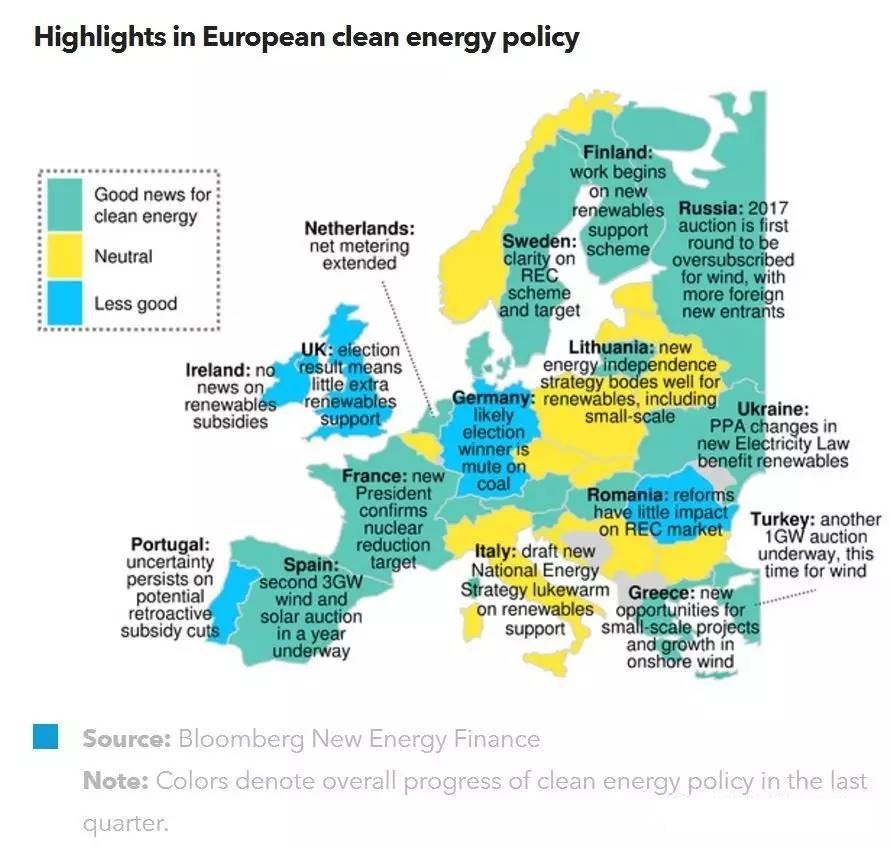 中國儲能網(wǎng)訊:歐盟政府意圖削減可再生能源項目補貼的態(tài)度使歐洲近期可再生能源項目招標數(shù)量激增 - 相比去年的5GW, 2017年上半年的總招標容量達14GW。在2017年第二季度可再生能源項目政府補貼同比下降49%之后,出現(xiàn)這一招標結(jié)果對整個歐洲地區(qū)可再生能源項目的投資而言,絕對是個利好消息。歐洲大部分國家出臺的政策都是積極支持可再生能源發(fā)電發(fā)展的。在本歐洲電力政策展望報告所研究的32個國家中,2017年第二季度支持政策力度減弱的國家有8個,而本季度僅有4個國家面臨這一狀況。