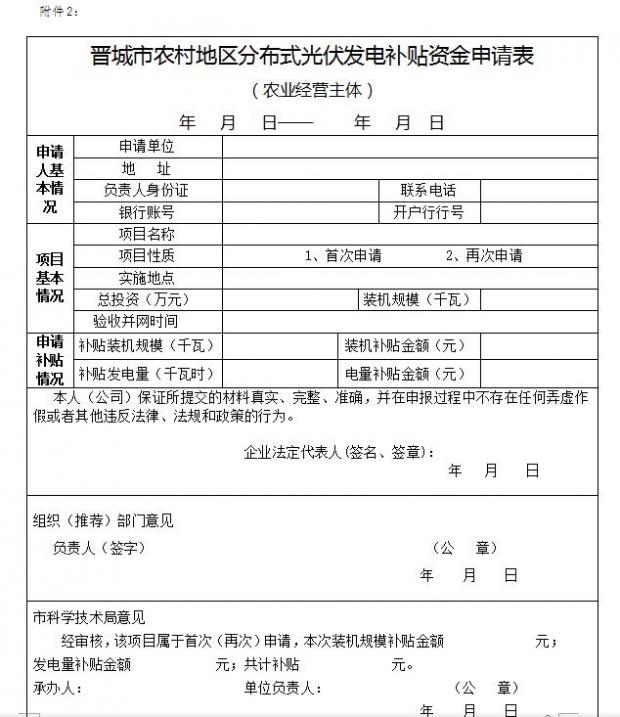 (一)《晉城市農(nóng)村地區(qū)分布式光伏發(fā)電補(bǔ)貼資金申請(qǐng)表》;