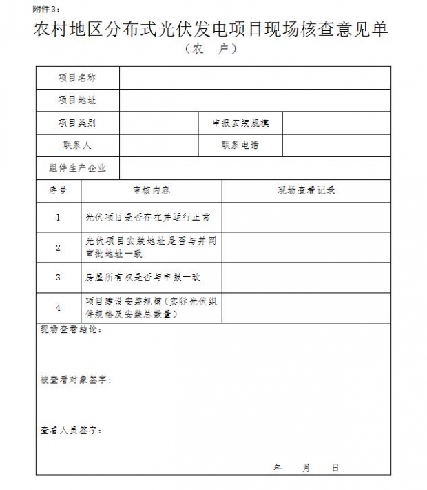 附件3:《農(nóng)村地區(qū)分布式光伏發(fā)電項(xiàng)目現(xiàn)場(chǎng)核查意見單(農(nóng)戶)》(詳見配圖)