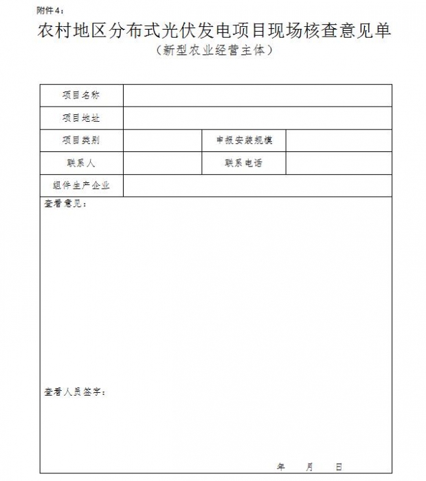 附件4:《農(nóng)村地區(qū)分布式光伏發(fā)電項(xiàng)目現(xiàn)場(chǎng)核查意見單(新型農(nóng)業(yè)經(jīng)營(yíng)主體)》(詳見配圖)