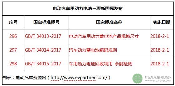 本次GB/T 34013-2017《電動汽車用動力蓄電池產(chǎn)品規(guī)格尺寸》、GB/T 34014-2017《汽車動力蓄電池編碼規(guī)則》、GB/T 34015-2017《車用動力電池回收利用 余能檢測》三項國家標準發(fā)布,使動力電池產(chǎn)品規(guī)格尺寸、編碼規(guī)則和回收利用余能檢測有標準可依,對動力電池行業(yè)規(guī)范發(fā)展具有重要意義,對動力電池企業(yè)乃至新能源汽車產(chǎn)業(yè)都將產(chǎn)生影響。
