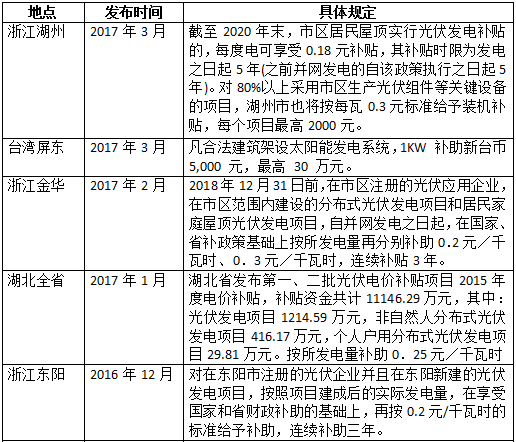 各地關于光伏補貼的政策文件層出不窮,記者將16年12月至今公開的文件進行了匯總,通過整理發(fā)現(xiàn),多數(shù)省份分布式光伏的補貼標準在0.2元—0.3元/kW·h,具體規(guī)定有細微差別,詳情見下表: