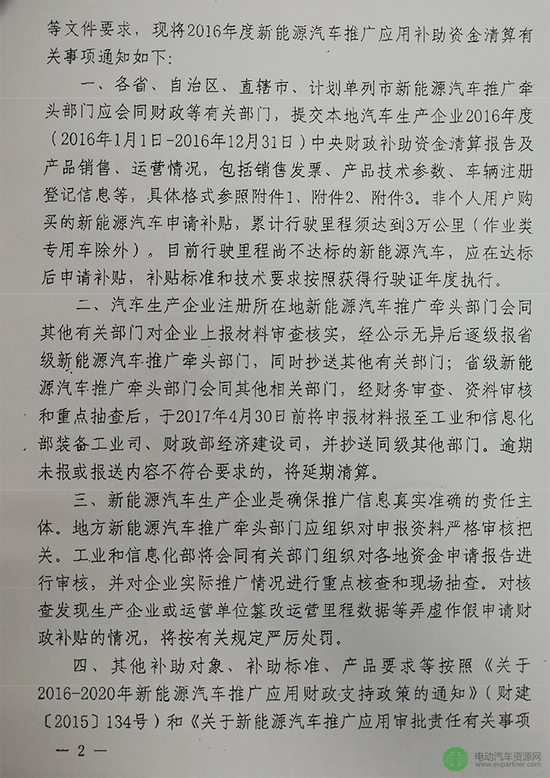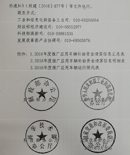 另外,該通知要求,省級新能源汽車推廣牽頭部門會同其他相關(guān)部門經(jīng)財務(wù)審查資料審核和重點抽查后,于2017年4月30日前將申報材料報至工業(yè)和信息化部裝備工業(yè)司、財政部經(jīng)濟(jì)建設(shè)司,并抄送同級其他部門,逾期未報或報送內(nèi)容不符合要求的,將延期清算。