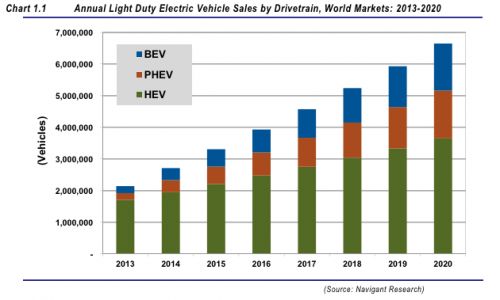 中國儲能網(wǎng)訊:全球綠色能源市場咨詢企業(yè)Navigant Research 20日發(fā)布最新前瞻報告稱,電氣化汽車(包含混合動力、插電式混合動力惡化純電動)到2020年將占據(jù)全球汽車市場7%的份額。