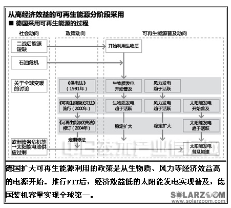 德國擴大可再生能源利用的政策是從生物質、風力等經(jīng)濟效益高的電源開始。推行FIT后,經(jīng)濟效益低的太陽能發(fā)電實現(xiàn)普及,德國裝機容量實現(xiàn)全球第一。[page]