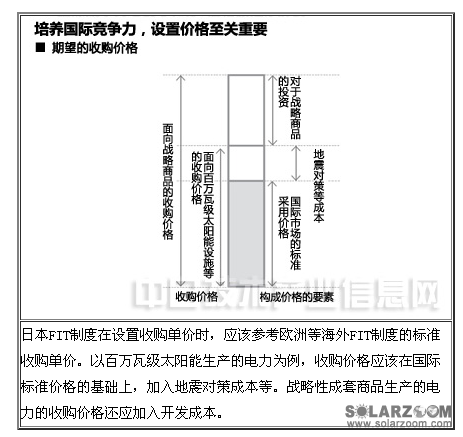 日本FIT制度在設置收購單價時,應該參考歐洲等海外FIT制度的標準收購單價。以百萬瓦級太陽能生產(chǎn)的電力為例,收購價格應該在國際標準價格的基礎上,加入地震對策成本等。戰(zhàn)略性成套商品生產(chǎn)的電力的收購價格還應加入開發(fā)成本。