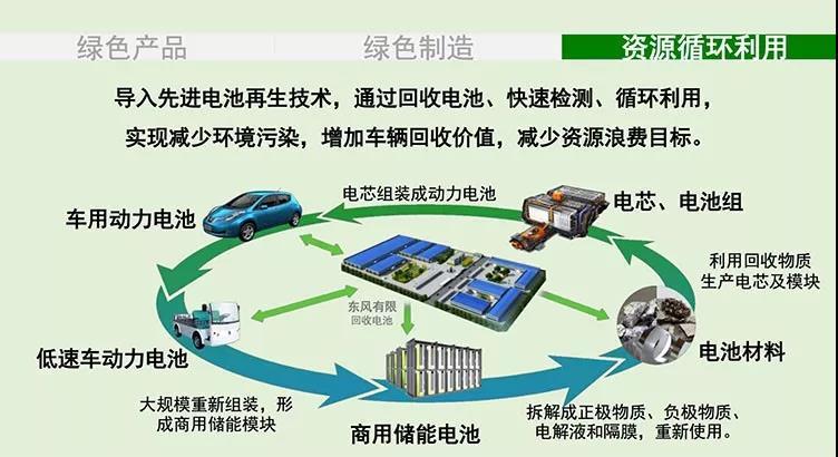 在資源再利用方面,東風有限計劃導入先進的電池再生技術,通過回收電池、快速檢測、循環(huán)利用,來實現(xiàn)減少環(huán)境污染,增加車輛回收價值,減少資源浪費的目標。該計劃的獨到之處是建立商用儲能設備,通過回收電池儲能,并利用谷電或可再生能源充電,向電動汽車和社會穩(wěn)定供電。