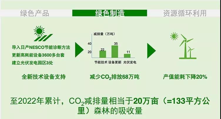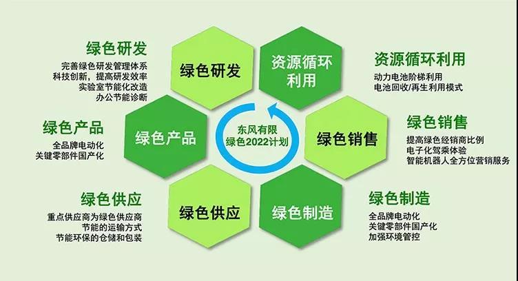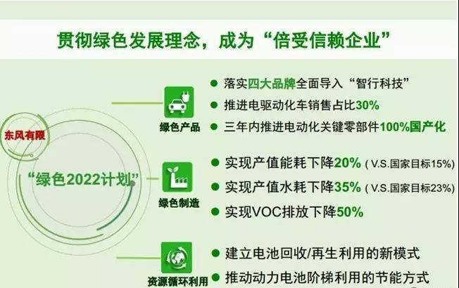 “綠色”和“智能”被東風有限看做是發(fā)力未來的關鍵。 其“綠色2022計劃”主要涵蓋三大層面,分別為綠色產品、綠色制造以及資源循環(huán)利用。