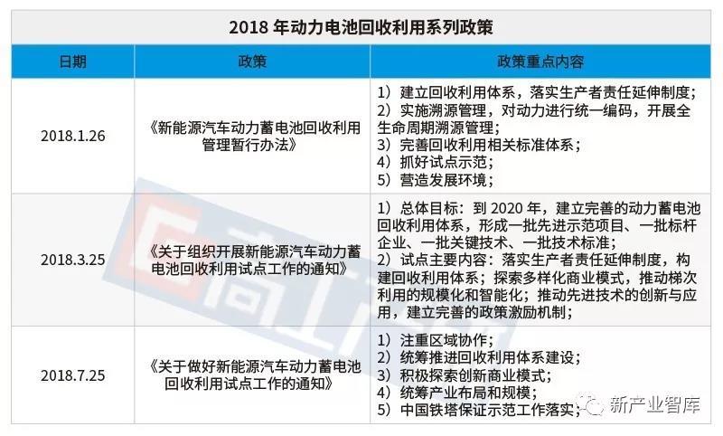 據(jù)2018年公布的一系列政策來(lái)看,從最初的總體方向的確定,到最終試點(diǎn)工作方案的詳細(xì)布局,動(dòng)力電池回收利用政策逐步完善。分析7月25日公布的《關(guān)于做好新能源汽車動(dòng)力蓄電池回收利用試點(diǎn)工作的通知》細(xì)則來(lái)看,有以下幾項(xiàng)重點(diǎn):