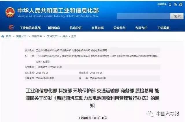 據(jù)悉,在新能源汽車動力蓄電池退役潮還沒來臨時,國家及相關部門已經(jīng)從頂層開始了動力蓄電池的溯源體系建設。今年,《新能源汽車動力蓄電池回收利用管理暫行辦法》等與動力蓄電池相關的政策法規(guī)陸續(xù)推出,表明我國政府對動力蓄電池回收利用問題高度重視,并走出規(guī)范管理的第一步。