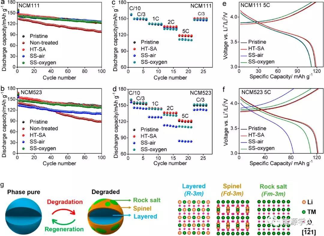 經(jīng)過水熱和燒結(jié)處理再生過程,不但材料中的鋰含量能回復(fù)到原始水平,其表面的尖晶石和巖鹽結(jié)構(gòu)也能轉(zhuǎn)變回為層狀結(jié)構(gòu)。如圖3所示,再生后的顆粒仍然保留了其形貌和尺寸分布,并且表面的晶體結(jié)構(gòu)回到了層狀結(jié)構(gòu)。作者除了采用了水熱燒結(jié)法進(jìn)行正極材料的再生,還采用了直接燒結(jié)法與前者進(jìn)行比較。直接燒結(jié)法是直接將一定量的碳酸鋰與循環(huán)后的材料進(jìn)行高溫長時(shí)間燒結(jié)(850攝氏度12小時(shí)),并在空氣和氧氣兩種氣氛下進(jìn)行。作者發(fā)現(xiàn),在氧氣中進(jìn)行直接燒結(jié)法同樣可以將表面結(jié)構(gòu)轉(zhuǎn)變回層狀結(jié)構(gòu),然而具有高鎳含量的NCM523顆粒在空氣中進(jìn)行直接燒結(jié)后,表面仍存有巖鹽相,并不能完全轉(zhuǎn)變回層狀結(jié)構(gòu)。而對于低鎳含量的NCM111,在氧氣和空氣中直接燒結(jié)的效果相同。作者發(fā)現(xiàn),正極材料中鎳的含量對再生條件有很大影響,鎳的含量越高,氧氣分壓對再生過程的影響越大。