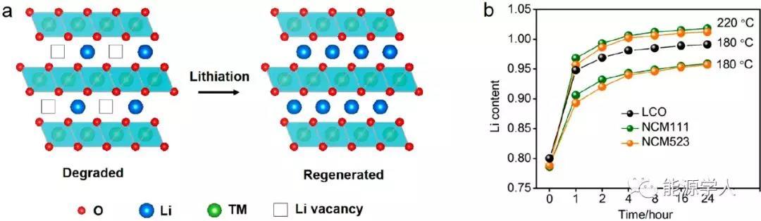 圖2.(a)向正極材料補(bǔ)充鋰的示意圖,(b)隨著水熱時(shí)間變化正極材料中鋰的含量