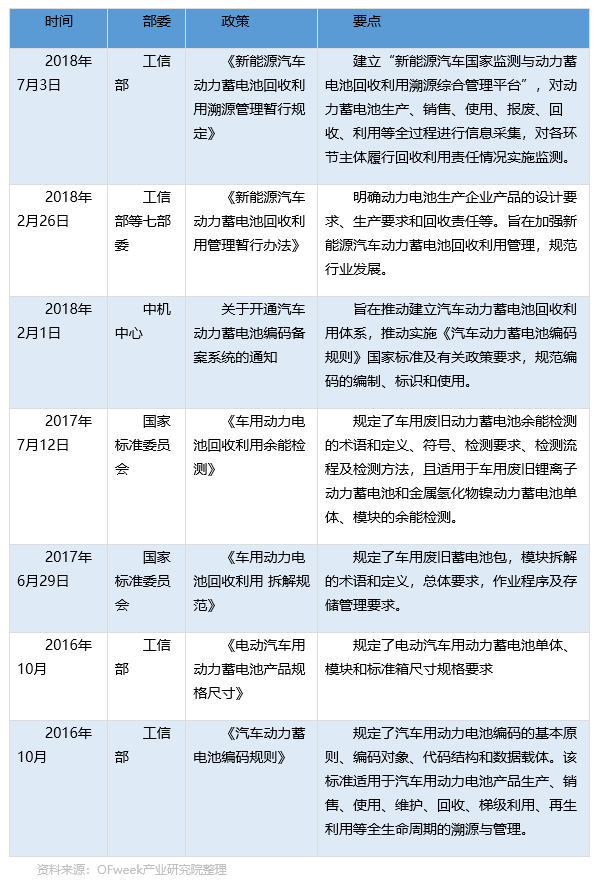 在這之前,已經(jīng)有《新能源汽車動力蓄電池回收利用管理暫行辦法》、《汽車動力蓄電池編碼規(guī)則》、《電動汽車用動力蓄電池產(chǎn)品規(guī)格尺寸》、《車用動力電池回收利用 拆解規(guī)范》和《車用動力電池回收利用余能檢測》等政策法規(guī)出臺,為動力電池的回收利用奠定了基礎(chǔ)。