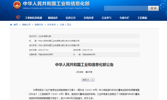 2018年7月3日,工業(yè)和信息化部公告《新能源汽車動力蓄電池回收利用溯源管理暫行規(guī)定》,自2018年8月1日起施行,旨在推進(jìn)動力蓄電池回收利用。辦法要求建立“新能源汽車國家監(jiān)測與動力蓄電池回收利用溯源綜合管理平臺”,對動力蓄電池生產(chǎn)、銷售、使用、報廢、回收、利用等全過程進(jìn)行信息采集,對各環(huán)節(jié)主體履行回收利用責(zé)任情況實(shí)施監(jiān)測。在溯源管理規(guī)定出臺之前,動力電池銷售后是無法跟蹤的,電池的運(yùn)行狀態(tài)和使用狀況都電池廠不得而知,在消費(fèi)者手里的動力電池報廢后也難以追溯到生產(chǎn)廠家進(jìn)行回收。此項目出臺后,將會更好的推進(jìn)動力電池回收的回收利用。
