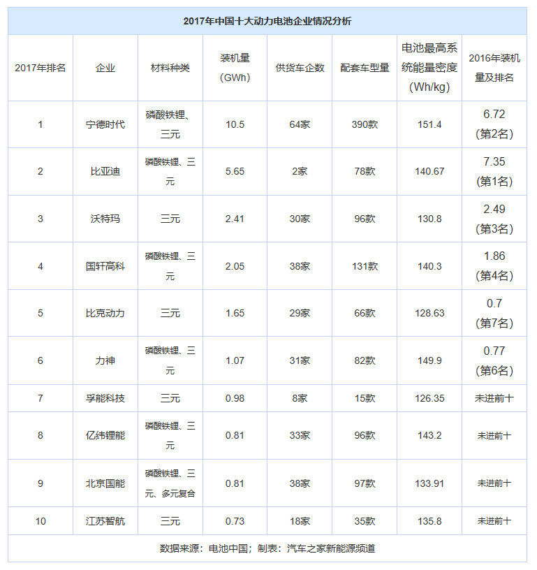 而統(tǒng)計(jì)2016年、2017年國內(nèi)排名前10的電池廠商數(shù)據(jù)可以發(fā)現(xiàn),寧德時(shí)代、比亞迪和沃特瑪在過去兩年一直居前三名,而三者的總和在2016年國內(nèi)電池裝機(jī)量的占比為59%,2017年則為51.2%。