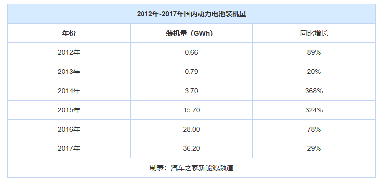 與新能源汽車行業(yè)一樣,動(dòng)力電池領(lǐng)域也迎來爆發(fā)期。與“2020年累計(jì)產(chǎn)銷500萬輛”目標(biāo)伴隨而來的,是對(duì)動(dòng)力電池超過100GWh的需求。這對(duì)于2012年裝機(jī)量?jī)H為0.66GWh的動(dòng)力電池行業(yè)來說,無疑是一個(gè)深不見底的潛在寶藏。更多的玩家紛紛涌入,僅僅3年之后,2015年國內(nèi)動(dòng)力電池的裝機(jī)量已經(jīng)達(dá)到了15.7GWh,2017年這一數(shù)值更是達(dá)到了36.2GWh,較2012年增長(zhǎng)了近55倍。