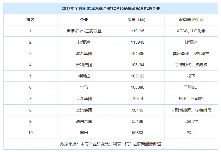 2012年國內(nèi)新能源汽車銷量?jī)H為1.28萬輛,為達(dá)到8年后“200萬銷量”的目標(biāo),國家出臺(tái)了一系列鼓勵(lì)政策:2013年9月,《關(guān)于繼續(xù)開展新能源汽車推廣應(yīng)用工作的通知》計(jì)劃對(duì)符合要求的純電動(dòng)汽車、插電式混合動(dòng)力汽車和燃料電池汽車給予補(bǔ)貼;2014年9月,新能源車免購置稅政策開始執(zhí)行,約車價(jià)10%的減免優(yōu)惠帶來的拉動(dòng)作用立竿見影,2014年新能源汽車?yán)塾?jì)生產(chǎn)8.39萬輛,同比增長(zhǎng)近4倍。而在2017年全球新能源企業(yè)銷量排名前十中,中國企業(yè)已占七位。