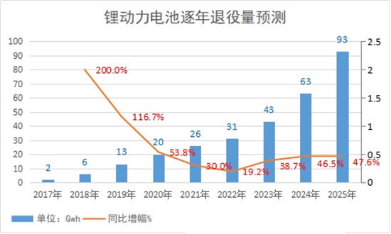 專業(yè)研究機(jī)構(gòu)發(fā)布報(bào)告稱,2020 年我國將有約 20Gwh 的動(dòng)力電池退役,2025 年將有大約 93Gwh 的動(dòng)力電池退役。由此帶來的電池回收利用規(guī)模在 2020 年將達(dá)到 107 億元左右。到 2025 年市場(chǎng)規(guī)模將達(dá)到 379 億元。由此可見,動(dòng)力電池的回收利用將快速形成一個(gè)巨大的新興市場(chǎng)。