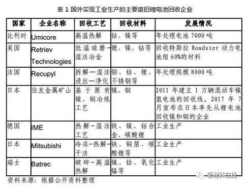 此前,歐美和日本的消費電池、家電電子等回收利用(主要方式是再生利用)取得了良性的發(fā)展,為動力電池的再生利用打下了良好基礎。從動力再生利用的實施主體上看,大多為專業(yè)的金屬冶煉回收企業(yè)或材料企業(yè)轉(zhuǎn)型而來。比利時優(yōu)美科、美國 Retriev Technologies、法國 Recupyl、日本住友金屬礦山等是全球較為知名的鋰電池再生企業(yè)。