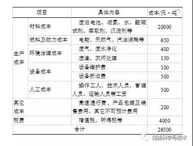 鋰離子電池中金屬材料回收的經(jīng)濟(jì)性可通過下列公式體現(xiàn):利潤(rùn)=回收收入-生產(chǎn)成本-其它成本-稅費(fèi)。其中,廢舊電池回收及再資源化過程中的生產(chǎn)成本由以下幾個(gè)部分組成。分析并計(jì)算廢舊三元電池中金屬回收的成本,結(jié)果見表4。