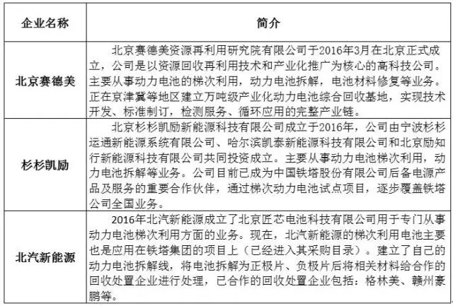 面對如此巨大的市場前景,企業(yè)紛紛布局動力電池梯次利用市場,其中參與鐵塔集團梯次利用儲能試點項目的企業(yè)就包括:北京賽德美、杉杉凱勵、北汽新能源等企業(yè)。