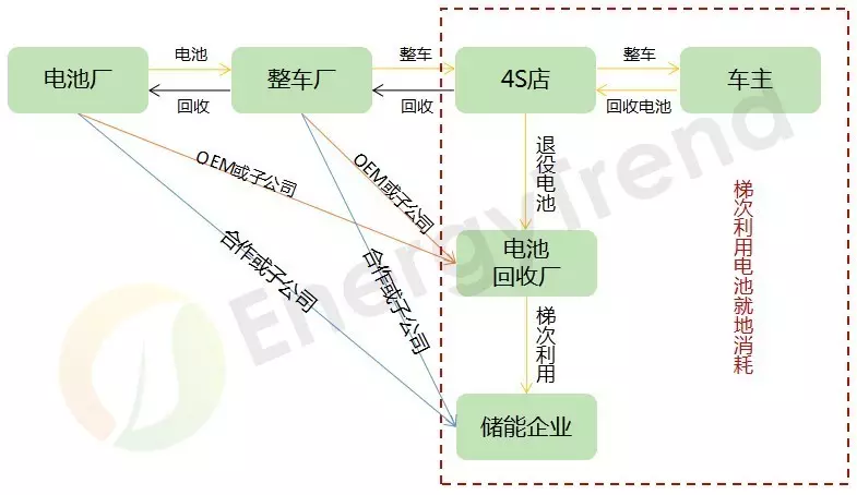 電動(dòng)汽車(chē)的動(dòng)力電池不論是體積還是重量都很大,退役的動(dòng)力電池要做到“回歸祖籍”目前較難實(shí)現(xiàn),回收過(guò)程中要支出大量人力財(cái)力,因此退役電池梯次利用應(yīng)就地消耗——目前,越來(lái)越多專(zhuān)業(yè)回收鋰電池的公司出現(xiàn),電池廠或整車(chē)廠可與這類(lèi)廠家合作,將動(dòng)力電池回收業(yè)務(wù)外包給這類(lèi)廠家,指定品牌下4S店將從車(chē)主那回收的動(dòng)力電池統(tǒng)一送往當(dāng)?shù)仉姵鼗厥諒S,進(jìn)行相關(guān)的回收檢測(cè)流程,SOC(電荷狀態(tài))高于60%的再出售給當(dāng)?shù)貎?chǔ)能企業(yè)進(jìn)行梯次利用,低于60%的進(jìn)行分解再利用。通過(guò)梯次利用檢測(cè)的電池可銷(xiāo)售給當(dāng)?shù)貎?chǔ)能廠家亦或是低速電動(dòng)車(chē)廠家。