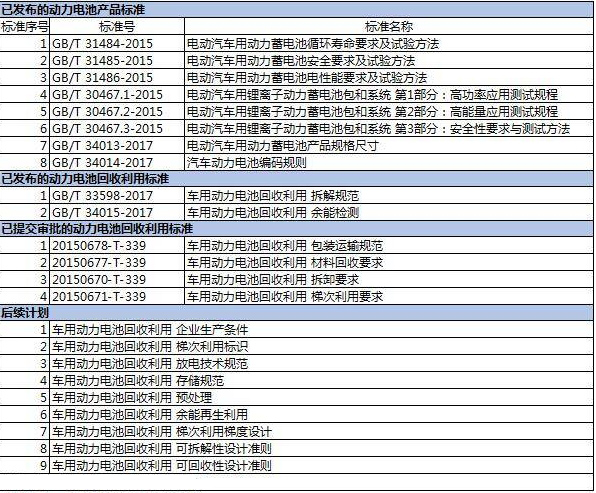 目前,關(guān)于動(dòng)力電池產(chǎn)品國(guó)家標(biāo)準(zhǔn)主要有8項(xiàng),集中規(guī)范了動(dòng)力電池性能測(cè)試要求與方法、動(dòng)力電池安全性測(cè)試要求與方法。關(guān)于動(dòng)力電池回收利用的標(biāo)準(zhǔn),已發(fā)布的標(biāo)準(zhǔn)有2項(xiàng)、已提交審批的標(biāo)準(zhǔn)有4項(xiàng)目,還有9項(xiàng)后續(xù)計(jì)劃出臺(tái)的標(biāo)準(zhǔn)。