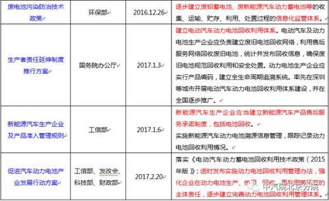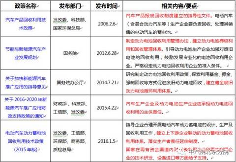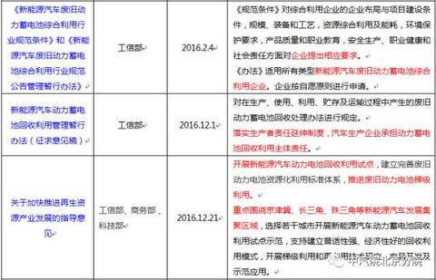 中國儲能網(wǎng)訊:近年來,在國家政策的引導(dǎo)和推動下,我國新能源汽車產(chǎn)業(yè)發(fā)展迅速,隨著新能源汽車逐漸進(jìn)入報廢期,車用動力電池的回收利用問題也會越來越突出。政府高度重視動力電池回收利用的工作,已經(jīng)出臺多項(xiàng)相關(guān)政策來推動動力電池回收利用產(chǎn)業(yè)的發(fā)展(見表1)。