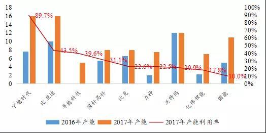 2016-2017年中國主要電池企業(yè)產(chǎn)能(GWh)及產(chǎn)能利用率