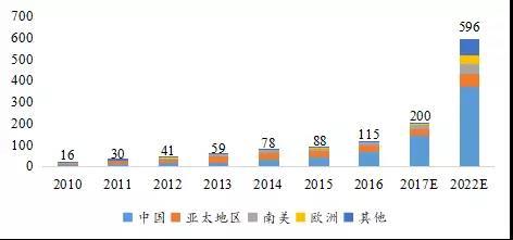 2011-2017年全球不同類型鋰電池出貨量(單位:GWh)