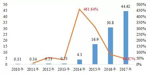2010-2017年中國動力鋰電池產(chǎn)量(GWh)及同比增速