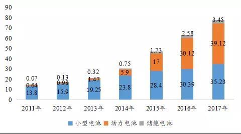 2011-2017年中國不同類型鋰電池出貨量(單位:GWh)