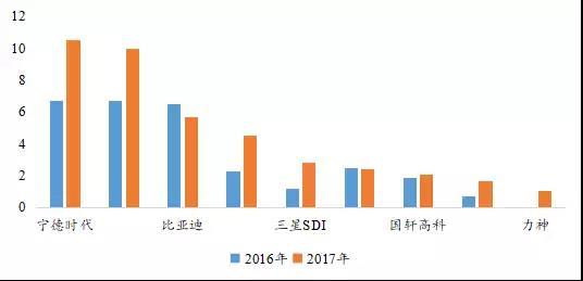 2016-2017年全球主要動力電池企業(yè)出貨量(單位:GWh)
