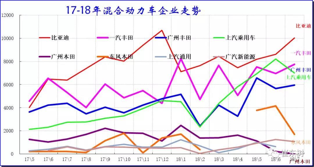 混動車型主要主要是豐田和本田的普通混動的表現(xiàn)很突出,普通混合動力月度走勢相對平穩(wěn)。18年1-7月一汽豐田呈現(xiàn)了一個超強的走勢,一汽豐田保持了8000臺的規(guī)模,7月的走勢也是較好。而廣州豐田普通混動的走勢也是相對平穩(wěn)的,7月生產(chǎn)銷售較少。