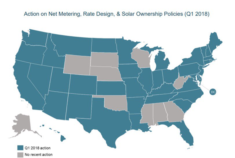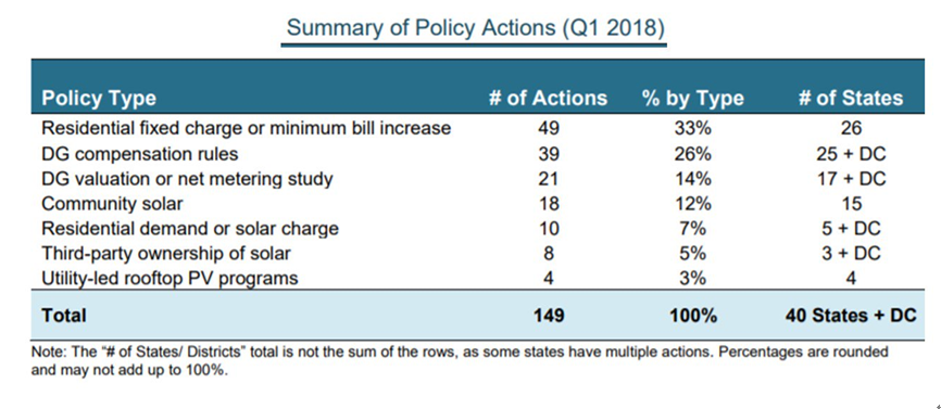 NCCETC新的報告顯示,2018年第一季度的149項政策行動在40個州實施。許多人都對公用事業(yè)的應(yīng)對措施感到擔憂,59家公用事業(yè)公司要求增加所有住宅太陽能客戶的月度固定費用或最低費用。