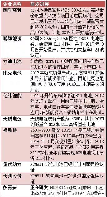 在國內(nèi),NCM811頻繁出鏡,國內(nèi)諸多鋰電企業(yè)都表示出了對NCM811電池產(chǎn)能布局的熱情。從下表可以看出,有諸多動力電池企業(yè)宣稱已經(jīng)商用811,還有一批企業(yè)已經(jīng)做好了量產(chǎn)供應(yīng)的準(zhǔn)備,也有一批還處在研發(fā)、測試階段。