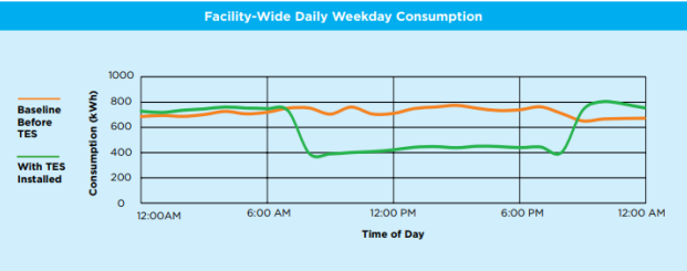 Viking公司得出的最終研究結(jié)果是,其儲(chǔ)能設(shè)施能耗降低了13%。更重要的是,熱儲(chǔ)能設(shè)施將峰值制冷負(fù)荷降低了251千瓦,減少29%的負(fù)荷,每天持續(xù)工作13小時(shí)。