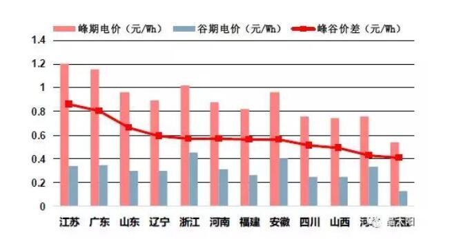 根據(jù)國家電網(wǎng)數(shù)據(jù),全國用電大省峰谷價(jià)差分布于0.4~0.9元/kWh,特別的,對(duì)于江蘇和廣東兩個(gè)用電量全國前二的省份,其峰谷價(jià)差高于0.8元/kWh,為用戶側(cè)利用儲(chǔ)能來套利峰谷價(jià)差提供了可觀空間。
