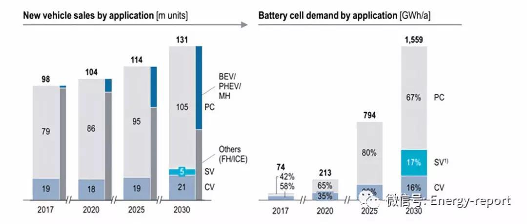 預計全球xev的銷量在未來10年內(nèi)將大幅增長。推動這一發(fā)展的主要因素是中國和歐盟的監(jiān)管框架,這些框架遵循嚴格的二氧化碳減排路徑。因此,對電池的需求預計將在距離今天的基地不遠的幾年內(nèi)成倍增長??傮w而言,汽車乘用車(pc)的需求預計將從2017年的74兆瓦增長到2030年的約1,050兆瓦。