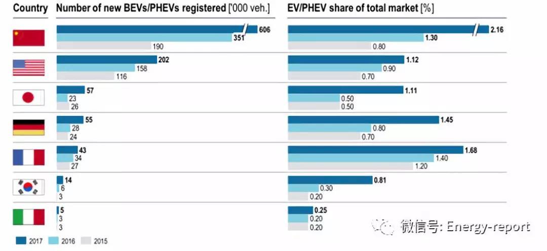 在經(jīng)歷了2016年的一段停滯之后,日本市場現(xiàn)在正急劇回升,并實現(xiàn)了高速增長。和日本一樣,韓國也經(jīng)歷了三位數(shù)的增長率,但由于xEVs汽車在市場中所占的份額還不到1%,韓國正處在第六位。意大利仍在等待其市場達到任何顯著的增長水平,部分原因是缺乏國產(chǎn)原委托制造商提供的電動車型,2017年xEVs汽車在其新車注冊中所占份額為0.25%(圖8)