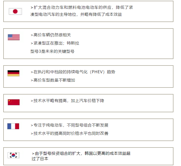 法國維護了自己在技術方面的領先地位。法國原委托制造商已經(jīng)擴大了他們相對狹窄的產(chǎn)品范圍,推出了一些插電式混合動力電動汽車(PHEVs),但仍然主要關注于提供高性價比的低成本小型電動汽車(BEVs)。德國汽車制造商的投資組合反映了向插電式混合動力電動汽車和電池電動運動多功能車(suv)的轉變,而且車型更多。這使得分析過的車輛的技術性能略有下降。因此,與去年相比,德國有所失勢,但仍能在技術領域保持第二的位置。德國原裝設備制造商在不久的將來宣布并計劃大量推出新的xEV車型,這導致預計在即將進行的評估中指標技術將會增加。