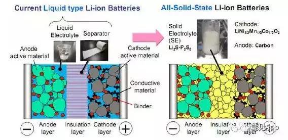 目前商業(yè)化的鋰離子電池電解液是液態(tài)的,因此也被稱為液態(tài)鋰離子電池。簡單來說,全固態(tài)鋰離子電池就是指電池結構中所有部件都是以固態(tài)形式存在,把傳統(tǒng)鋰離子電池的液態(tài)電解液和隔膜替換為固態(tài)電解質。